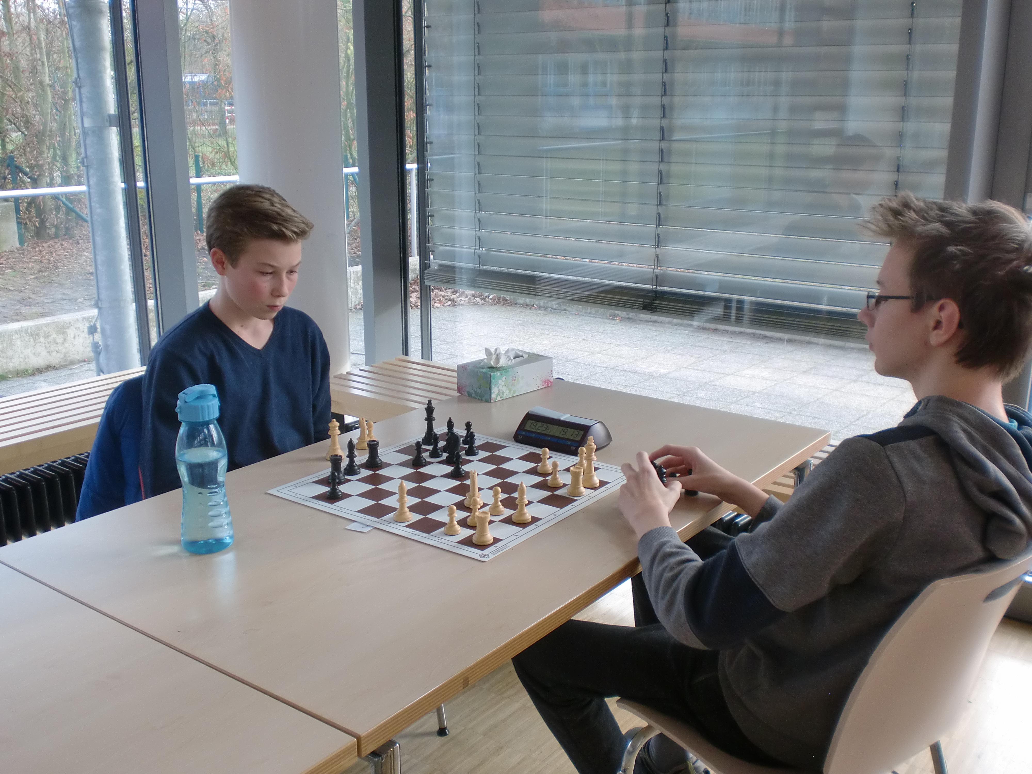 Spitzenspiel an Brett 1: Titelverteidiger Jan-Okke Rockmann mit Weiß gegen Nr. 1 der Setzliste, Collin Colbow