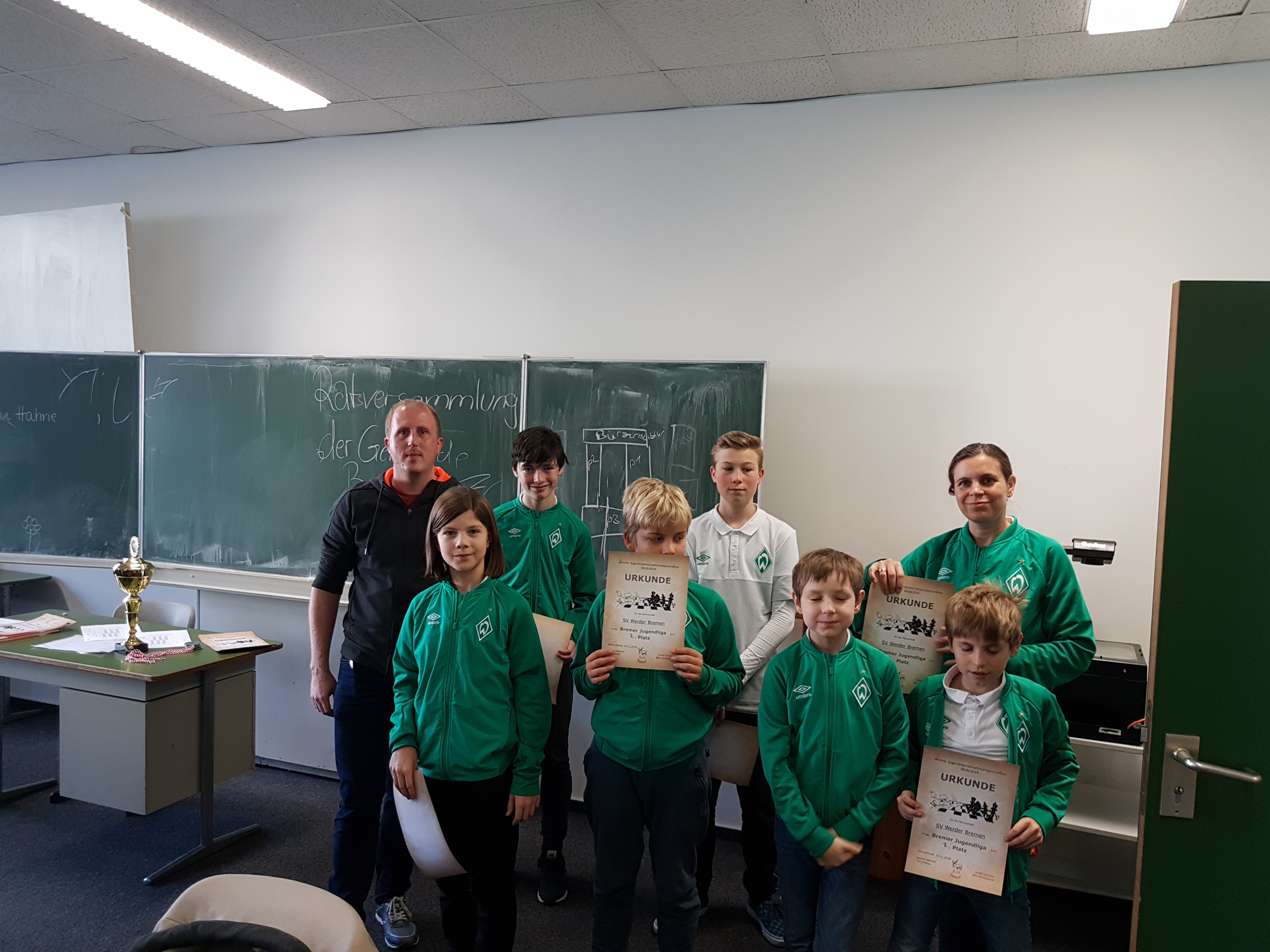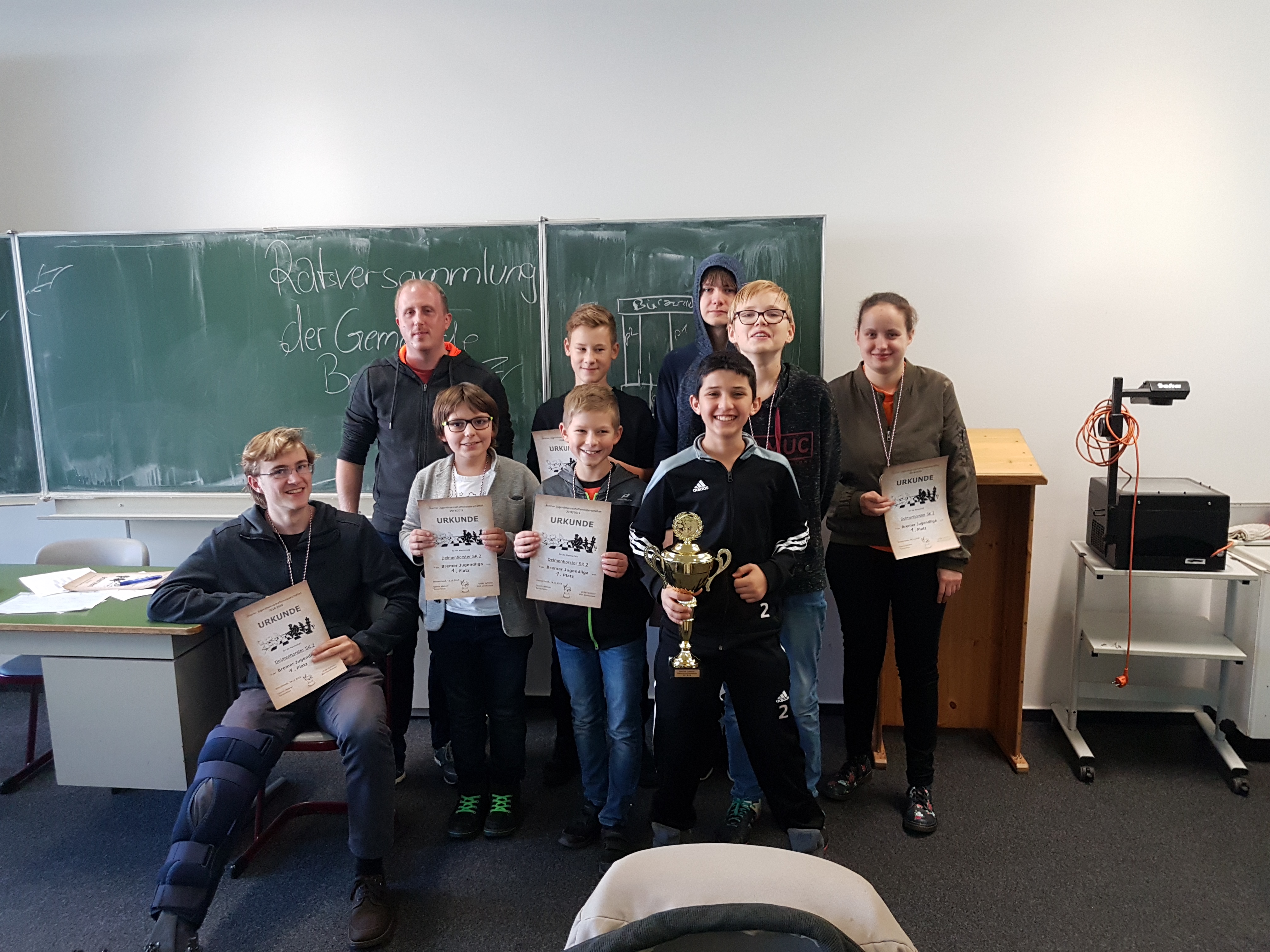 Kommen wir zum Sportlichen: Nach einigen Jahren der Abstinenz wurde wieder eine Jugendliga ausgetragen. Leider meldeten nur zwei Vereine (DSK 2 und Werder), die dann am Samstag das Hin-, am Sonntag das Rückspiel austrugen. Werder Bremen hatte Neuzugang Collin Colbow an Brett 1 aufgeboten, der auch prompt 2 Punkte beisteuerte. Dahinter setzte man überwiegend auf die Mitglieder der letztjährigen U12-Meistermannschaft. Diese boten den deutlich erfahreneren Delmenhorstern zwar sehr gut Paroli, am Ende setzten sich aber doch die Favoriten durch. Nachdem das Hinspiel am Samstag noch unentschieden endete, gewann der DSK am Sonntag mit 4:2 und ist damit neuer Bremer Jugend-Mannschaftsmeister. Herzlichen Glückwunsch!