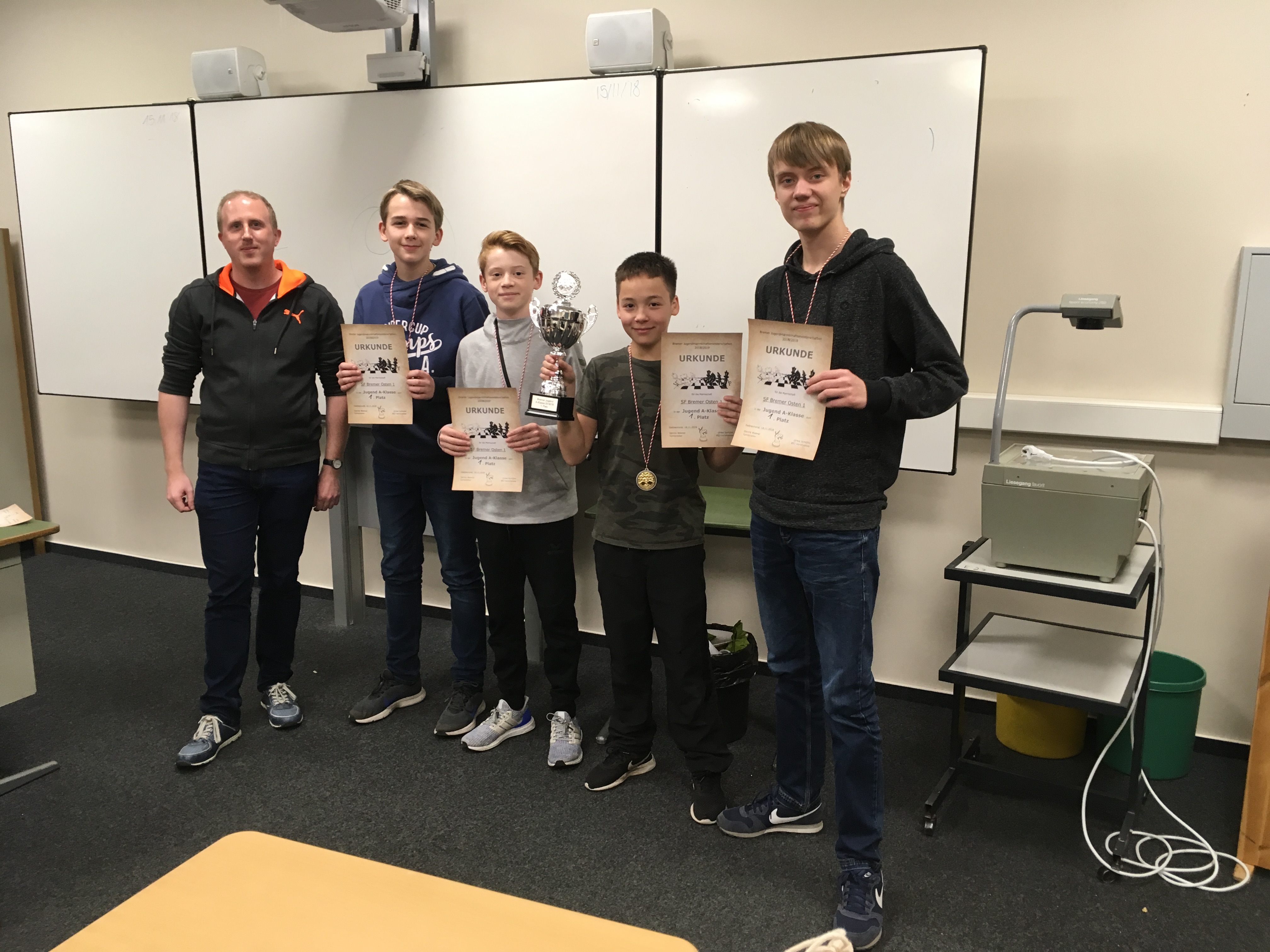 In der A-Klasse wiesen kurioserweise gleich zwei Teams einen höheren DWZ-Schnitt auf als die beiden Teilnehmer der Jugendliga. Ungeschlagen mit fünf Siegen aus fünf Matches und satten vier Mannschaftspunkten Vorsprung auf den Zweitplatzierten sicherten sich die Schachfreunde Bremer Osten hier die Meisterschaft. Mit Diyar Bakiyev (Brett 3) und Alexander Giss (Brett 4) stellten sie auch die beiden erfolgreichsten Spieler des Wochenendes; beiden gelang der Traumscore von 5 aus 5. Über eine perfekte Ausbeute durfte sich auch der Varreler Fabian Gesell mit 4 aus 4 freuen.