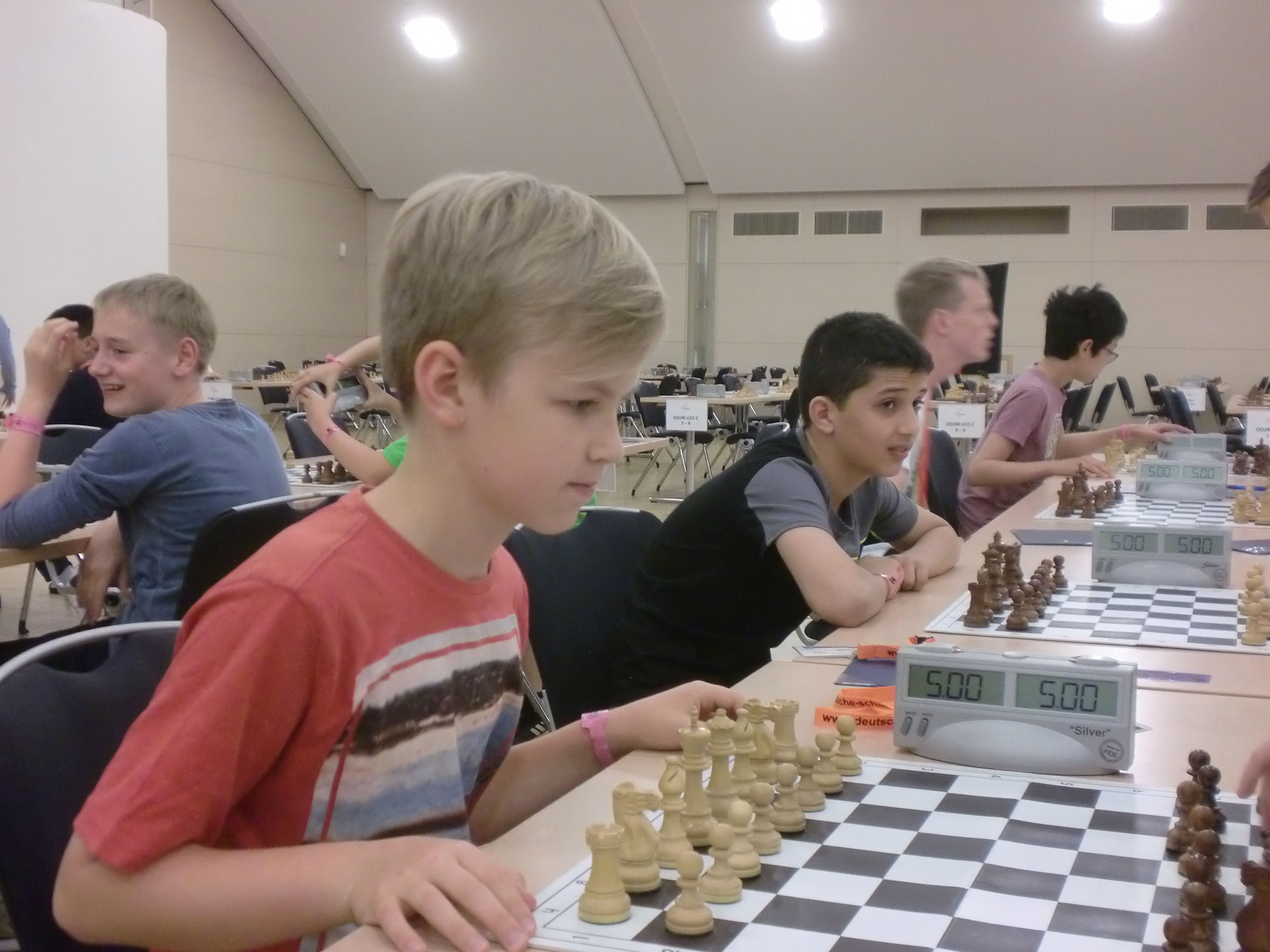 In der U10 standen heute gleich zwei Runden auf dem Programm. Während wir beim letzten Mal, als der Spielsaal überwiegend leer war, keine Punkte zu feiern hatten, lief es diesmal deutlich besser. Emilia war glänzend aufgelegt und schloss gleich zwei Mattangriffe erfolgreich ab. Und Justus konnte nach einem starken Remis am Vormittag in der Nachmittagsrunde einen 400 Punkte stärkeren Gegner sogar besiegen und liegt damit bereits bei 4,5 Punkten. Ich muss ehrlich zugeben, das hatten wir vom Vorletzten der Setzliste bei seiner ersten DEM nicht unbedingt erwartet.