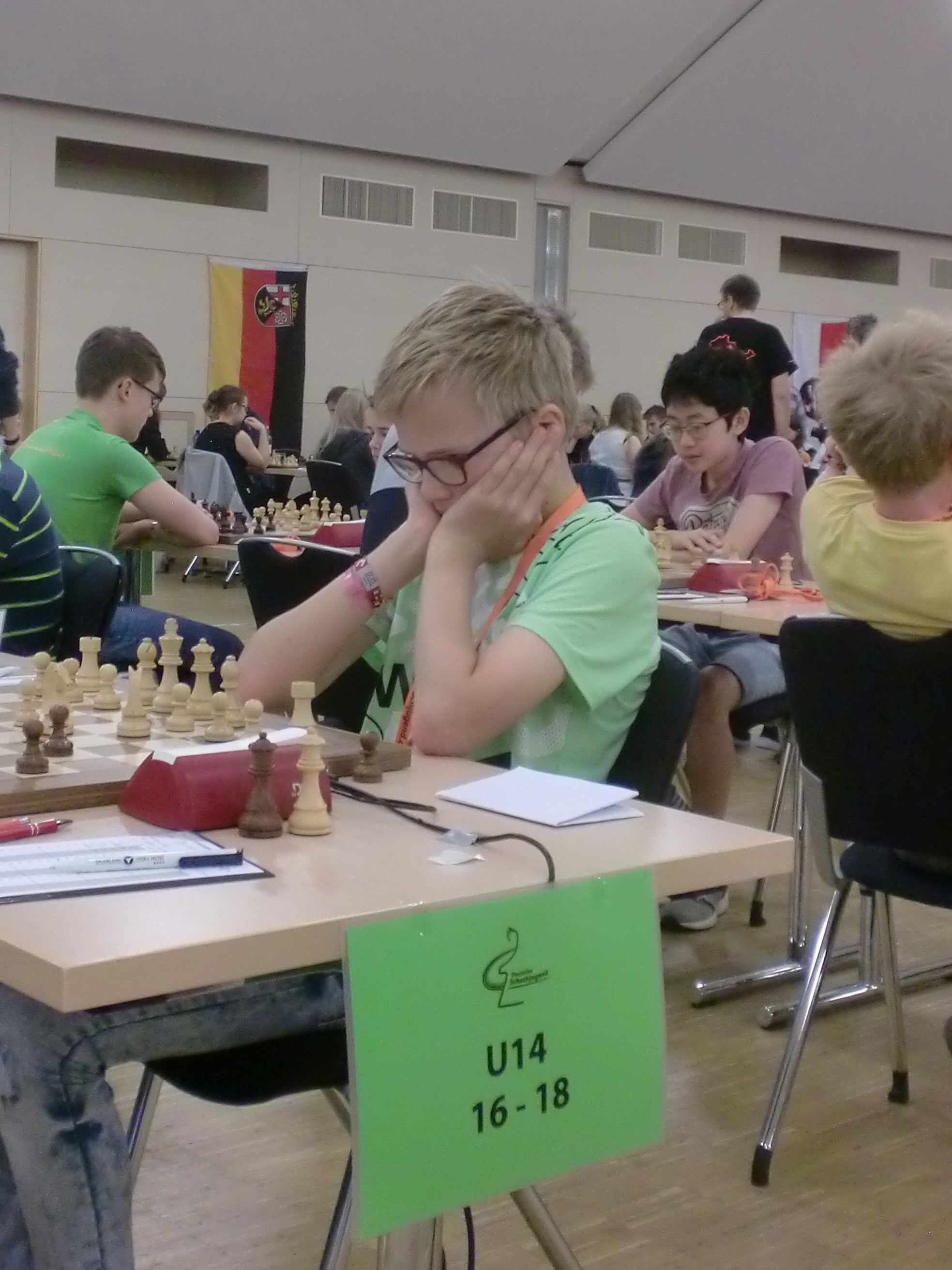 Einen schweren Stand hatten unsere U12-Jungs zu befürchten. Mit 3,5 Punkten gegen bis zur letzten Runde ausnahmslos stärkere Gegner schlug sich Moritz dabei aber sehr beachtlich. Für den Bremer Meister Samuel war sein bislang größtes Turnier vielleicht noch ein wenig ehrfurchterregnd , doch mit einem starken Schlussspurt kam er noch auf drei Punkte.