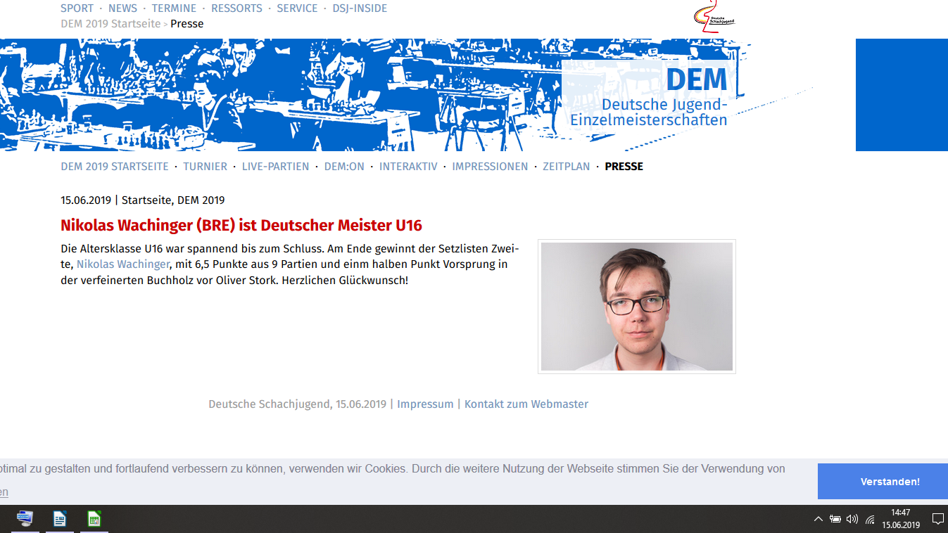 Man könnte übrigens argumentieren, für einen kurzen Moment war Nikolas Deutscher Meister. Jedenfalls veröffentlichte die Deutsche Schachjugend prominent ganz oben auf ihrer Homepage die folgende Meldung: