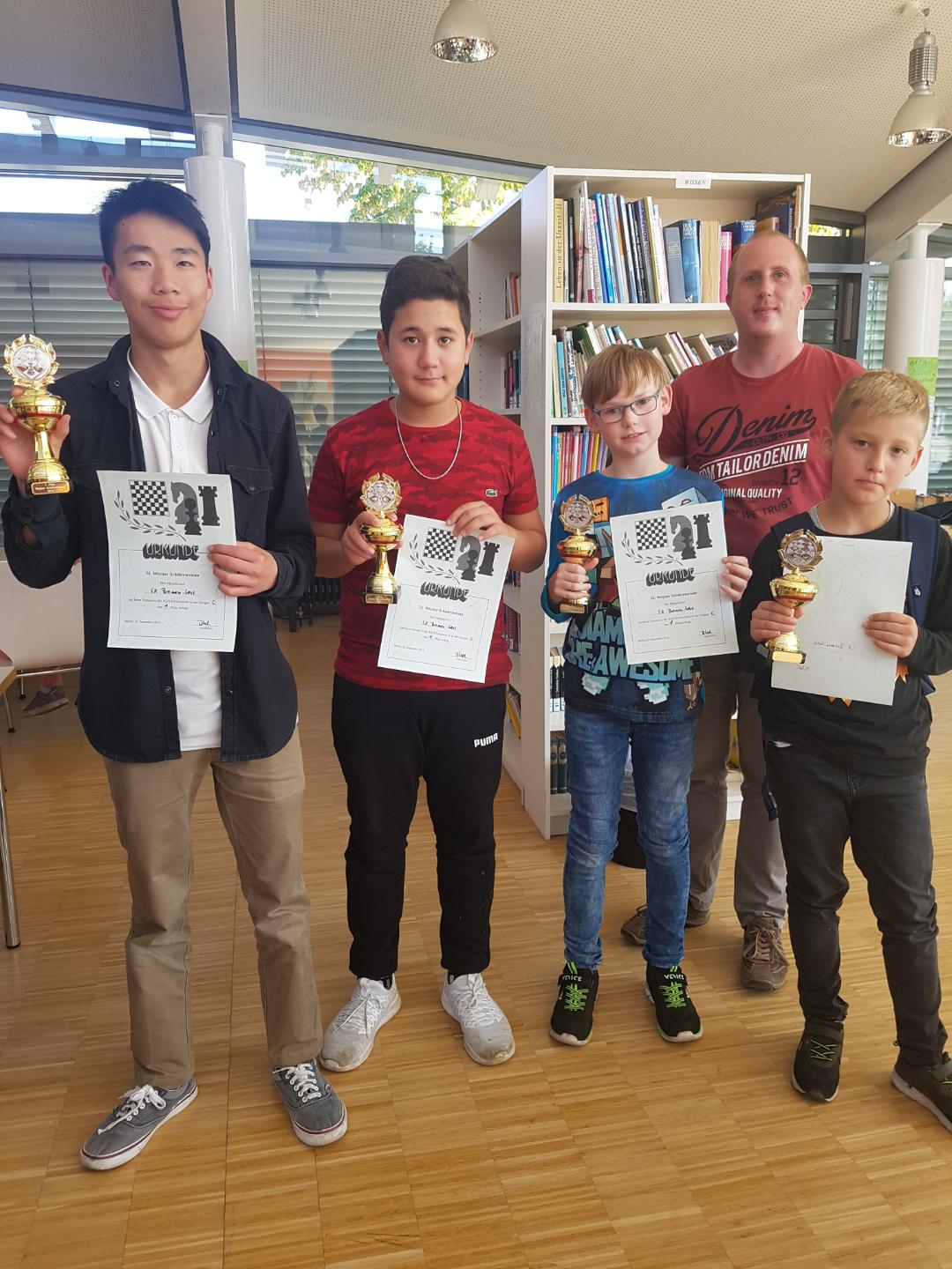 Beide trugen somit souverän den Sieg in ihrer jeweiligen Kategorie davon, wobei dem Turnierleiter das Kuriosum widerfuhr, fünf Pokale an die fünf Spieler eines Teams zu vergeben, das an diesem Tag null Mannschafts- und null Brettpunkte geholt hatte. Aber das war ja nicht ihre Schuld; die Delmenhorster Grundschüler haben sich immerhin hergetraut, andere Mannschaften waren auch eingeladen und hätten gerne kommen dürfen.